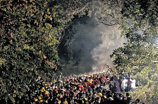 The two-kilometre stretch from Chilukalagutta to Medaram came alive with rangoli, lamps, drumbeats, tribal songs and dances, and ritual animal sacrifices. Sammakka reached her altar at 10.15 pm.