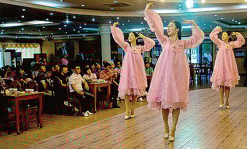 Behind her, one could see the big video screen hung on the wall, hypnotically looping pictures of Pyongyang—wide roads, tall buildings, fountains. But, this idyllic city was devoid of human presence—none of them showed a single denizen. The clock struck nine and the show began, and the waitresses turned their attention from tables to the musical performance. To taped Karaoke music, two of them first sang a Korean song, their gestures and facial expressions well-coordinated, sharing the mike with a Korean customer.