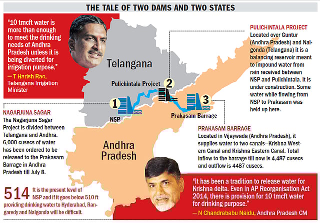 The first signs of trouble became visible on June 24 when Telangana government expressed its reluctance to release water to Prakasam Barrage from Nagarjuna Sagar Project. The order for release of water was given by a committee of experts constituted by the governor in March when the state was under President’s rule. On the appointed day—June 24—Telangana government did not honour the order contending that it was an order issued by an ad hoc committee when there was no elected government. Now that there is one, it would take a fresh look at the demand of the Andhra government.