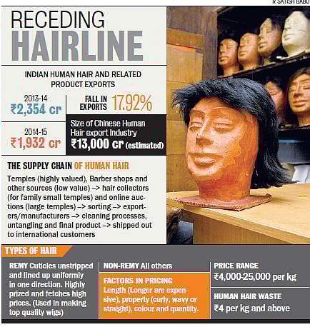 Figures from both industry sources and the Ministry of Commerce tell the tale. The past fiscal year saw human hair and related product exports fall by more than Rs 400-odd crore compared to the previous year. The total export revenue for the previous year was Rs 2,354 crore. This translates to a decline of about 17 per cent.
