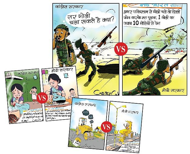 One cartoon shows Manmohan Singh on a road-roller, with blurbs on corruption, bribery and the speed of road construction to be 2 km per day. In comparison, Modi is constructing roads at 18 km per day.