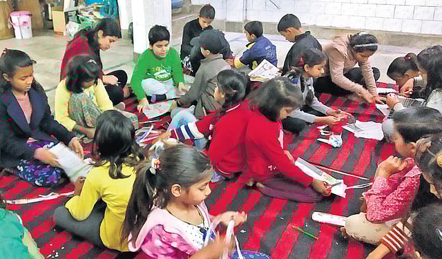 The centre opened in 2016, and is entirely funded by her. She opines that there are few who want to promote art philanthropically. “I am retired with no family responsibilities so I can spend on it. Otherwise funding is a big issue.” The classes are held for an hour at the premises of Bhagwan Devi School in the evening, five days a week, for the children of drivers, maids and other workers. “We have 40 kids, and you won’t believe the amount of creativity each of them have. Sadly, there is no outlet for them,” says Jain, adding, “Unfortunately, their parents want them to work and earn money and not go to school and learn skills.”