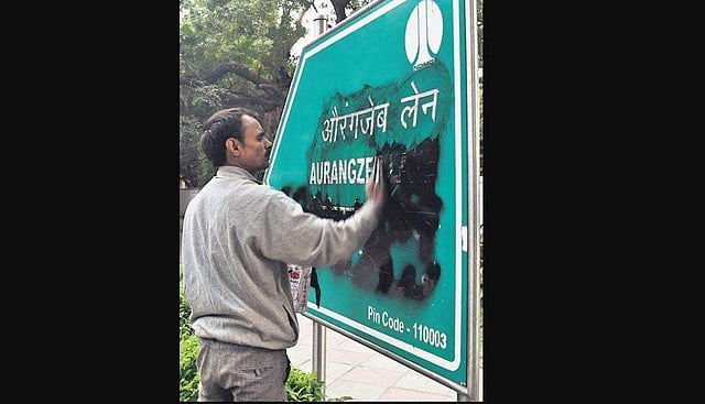 The police received a call around 5.40 am that few persons had gathered and were defacing the signage boards at Aurangzeb lane.