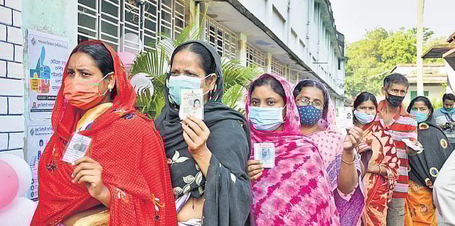 Till 5 pm, 70 per cent and 76 per cent electorates turned out at the polling booths in Dinhata and Shantipur constituencies respectively, which were won by the BJP’s two sitting MPs in the Assembly elections who decided to continue as MPs. The other two constituencies, Khardah and Gosaba, which are known as TM’s strongholds, were won by the TMC but both the MLAs died of Covid-19 and the constituencies recorded polling of 64 per cent and 75 per cent respectively till 5 pm.
