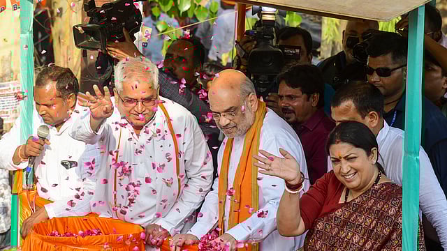 Shah, atop a four-wheeler turned into a rath (chariot), was flanked by party candidate Smriti Irani and UP BJP chief Bhupendra Chaudhury, among other leaders. Wading through a huge crowd of BJP cadre and people of Amethi, the roadshow, which commenced from Ramleela Ground culminated at Devipattan temple. Groups of saffron-clad youth could be spotted at various locations along the roadshow route dancing, blowing conch shells and beating ‘damroos’ while the party supporters fluttered BJP flags shouting the slogans.