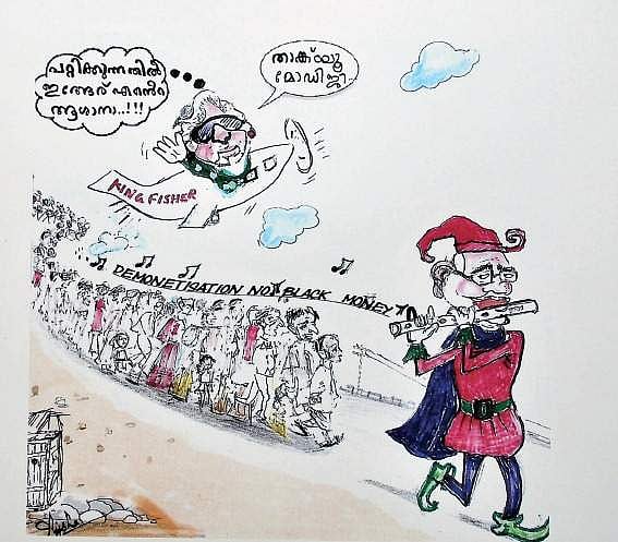 THIRUVANANTHAPURAM: At the far end of the hall of the Press Club, there is a cartoon of a Pied Piper, in the figure of Prime Minister Narendra Modi, leading a group of docile people (similar, to the famed fable where the Piper lured rats into the river). For the viewer, this is an obvious dig at the demontisation issue that has created havoc in the lives of people.