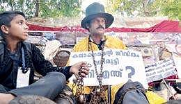 On Wednesday, Manu Mankombu chained himself up in a symbolic protest in front of the Secretariat to state his dissent against the decision.