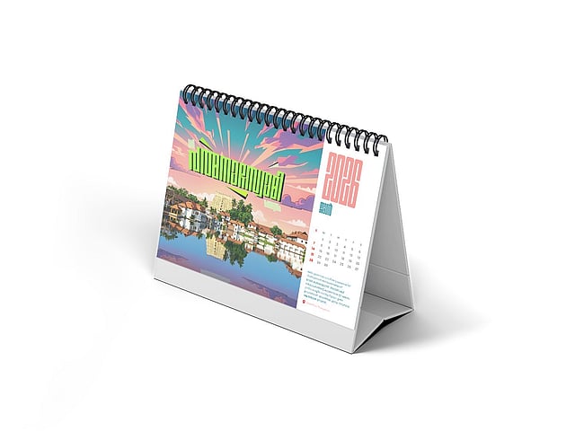 Designed as an A5 desk calendar, the calendar features 12 of the city’s most familiar and loved landmarks. From the shores of Kovalam beach, Padmanabhaswamy Temple, Beemapally, Vizhinjam, Ponmudi, Neyyar Dam, Shankhumukham, Kanakakunnu, Varkala, the Statue of Christ, and Technopark to Karyavattom Stadium, each month carries a slice of the capital’s identity. The illustrations are rendered in a pop-art style with short descriptions adding context.