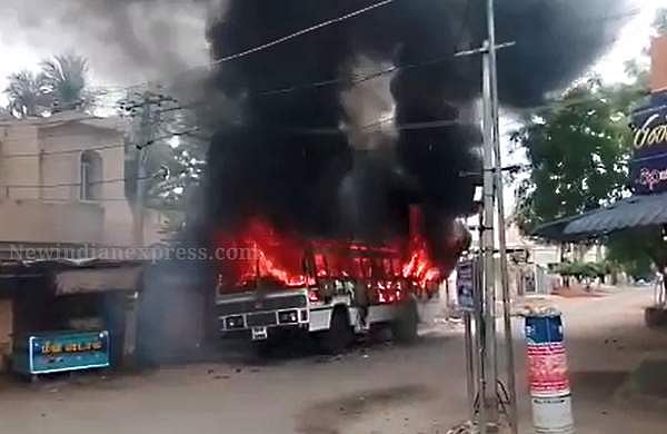 Thoothukudi Sterlite protest: Bus set ablaze by protesters at Bryant Nagar