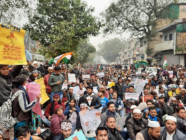 Protestors including students and local residents hold placards during a demonstration against the Citizenship Amendment Act near Red fort in New Delhi. (Photo| Shekhar Yadav, EPS)