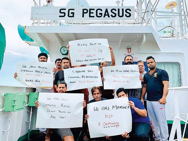 Indian seafarers on board MT SG Pegasus hold placards seeking help and highlighting their plight. (Photo | EPS)