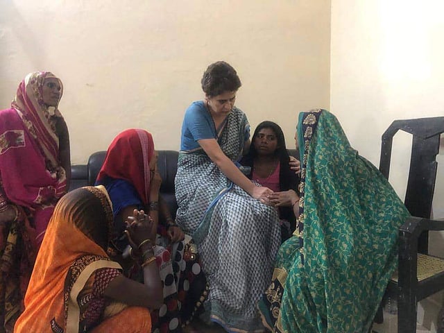 Congress General Secretary Priyanka Gandhi Vadra consoles a family member of a Sonbhadra massacre victim who had travelled to Chunar Fort to meet her after the former was stopped from proceeding to Sonbhadra in Mirzapur on 20 July 2019. (Photo | AICC)