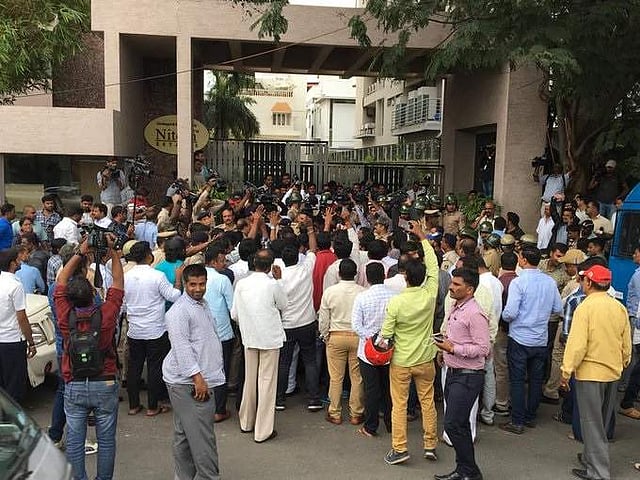 Several party workers have gathered outside a private apartment on Race Course Road believed to be housing the two independent MLAs. (Photo | Pandarinath B, EPS)