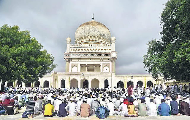 People offer prayers on the occasion of Eid al-Adha at Qutb Shahi Tombs in Hyderabad on Wednesday | S Senbagapandiyan