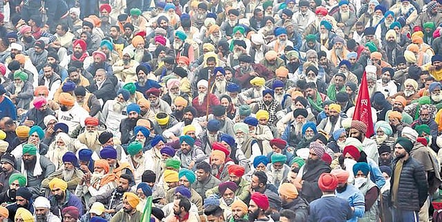 Protesting farmers gather in large numbers at the Singhu border on Saturday | PTI
