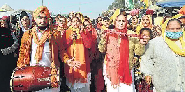 A group of agitating farmers from Punjab doing kirtan at Singhu border on Wednesday | Shekhar Yadav