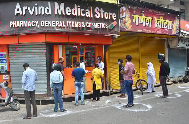 People maintain social distance as they stand outside a chemist shop in Moradabad. (Photo| PTI)