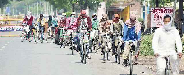 Migrant labourers pedal bicycles on their way from Rajasthan to their native places in Bihar amid lockdown | PTI