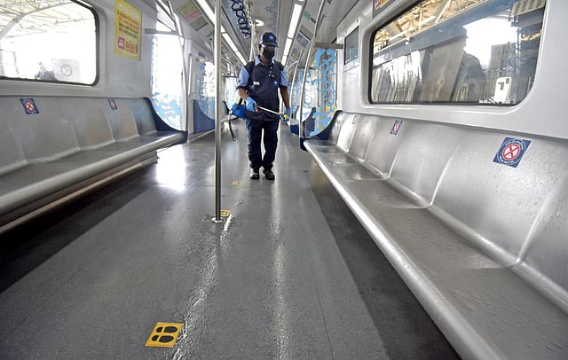 With Metro services set to resume on Monday signages to facilitate physical distancing have been installed inside trains as well as in stations. (Photo | S Senbagapandiyan, EPS)