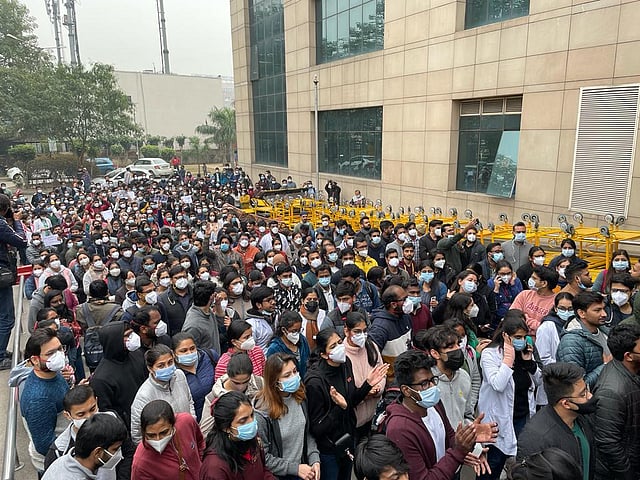 Doctors from across all government hospitals in Delhi have gathered at Safdarjung Hospital on Tuesday, December 28, 2021, to register their protest against the delay in the NEET PG counselling and the manhandling done by Delhi police against agitating doctors on Monday.
