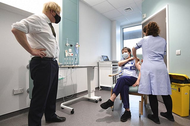 Britain's Prime Minister Boris Johnson watches as junior sister Susan Cole is injected with the Oxford-AstraZeneca Covid-19 vaccine. (Photo | AP)