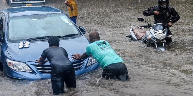Two men try to push the vehicle as it stopped working due to a waterlogged road during heavy rain, at Kings Circle, in Mumbai, Wednesday, June 9, 2021. (Photo | PTI)