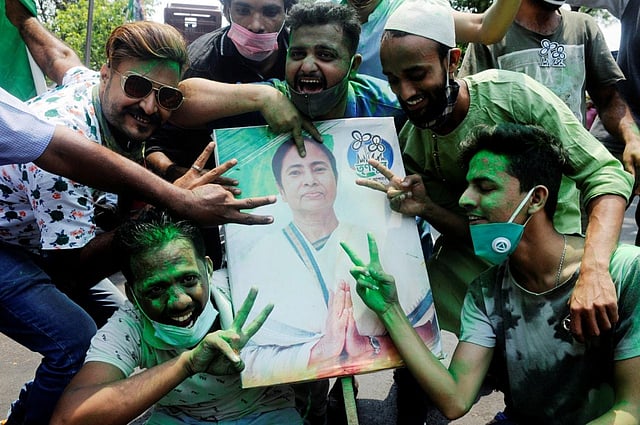 TMC supporters pose with a poster of Bengal CM Mamata Banerjee (Photo | PTI)