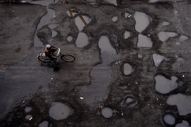 This ain't Mars and that ain't craters. Folks, a road with potholes near Vyasarpadi Flyover in Chennai. (Photo cops| Debadatta Mallick, EPS)