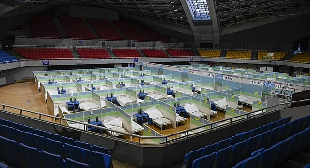 Beds for patients are seen in partitioned rooms at a makeshift fever clinic at a stadium amid the Covid-19 pandemic in Beijing. (Photo | AFP)