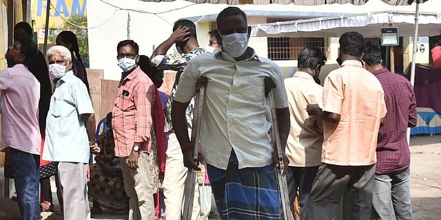 A physically challenged man returns after casting his vote at a polling booth for the Urban and local body elections, on Saturday, Feb 19, 2022, in Chennai. (Photo | EPS, P Jawahar)