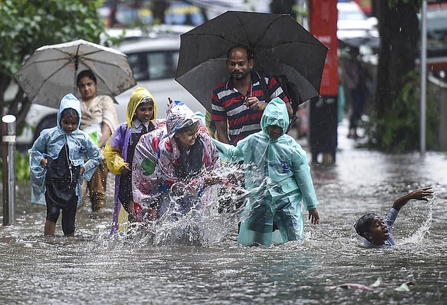 School students walk through a flooded street following heavy monsoon rains, in Mumbai. (Photo | PTI)