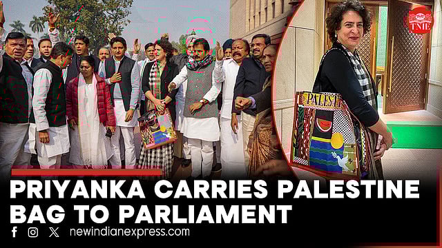 Priyanka Gandhi made a pro-Palestine statement at the Parliament during the winter session. She was seen carrying a bag with the word 'Palestine' emblazoned on it, along with Palestinian symbols like the watermelon and keffiyeh..Follow The New Indian Express channel on WhatsApp Download the TNIE app to stay with us and follow the latest