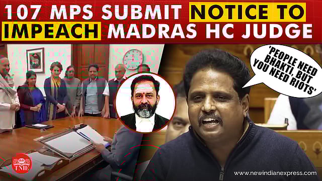 107 INDIA bloc MPs, led by DMK, submitted an impeachment notice against Madras HC judge G R Swaminathan over his orders allowing lamp lighting near a dargah in Thirupparankundram.