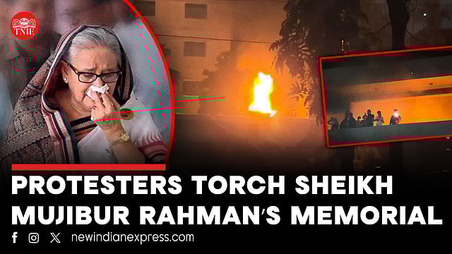 A large group of protesters on Wednesday vandalised and set on fire Bangladesh founder Sheikh Mujibur Rahman's residence in Dhaka during a live online address of his daughter and deposed prime minister Sheikh Hasina.