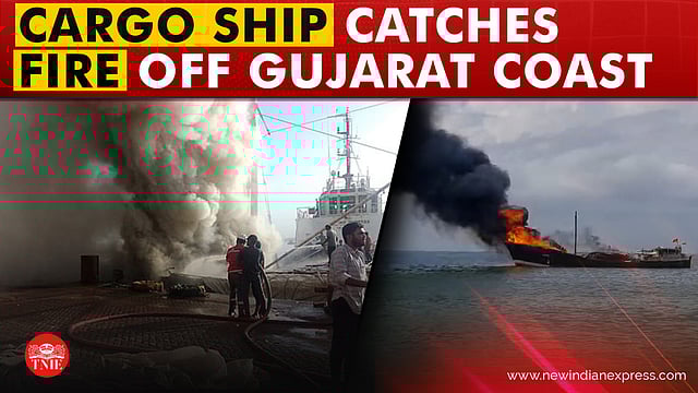A Jamnagar-based cargo ship, PDI 1383 Haridasran, loaded with 950 tonnes of rice and 78 tonnes of sugar caught fire at Porbandar Port, Gujarat, on Monday morning. No casualties were reported as all 14 crew members were safely evacuated after the rescue and firefighting operations.