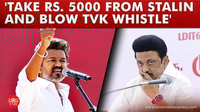 Reacting to CM Stalin’s announcement of Rs 5,000 aid for women under the Kalaignar Rights Scheme, Tamilaga Vettri Kazhagam (TVK) president Vijay claimed that the DMK feared the rising support for his party among women and urged voters to take the money but vote for the ‘whistle’.