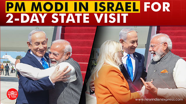 Prime Minister Narendra Modi arrived in Tel Aviv for a two-day state visit to Israel. He received a red-carpet welcome and Guard of Honour at Ben Gurion Airport, where Israeli PM Benjamin Netanyahu, along with his wife Sara, personally received him. The leaders shared a warm hug, reflecting their close ties. This is Modi’s second visit to Israel in nine years.