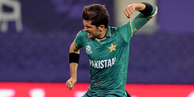 Pakistan's Shaheen Afridi celebrates the dismissal of India’s Rohit Sharma during a T20 World Cup match in Dubai. (Photo| ANI)