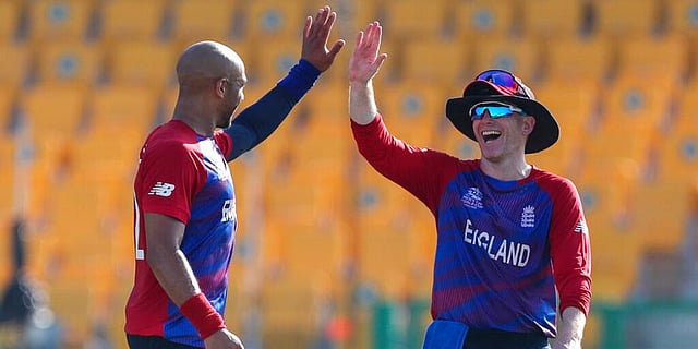 England's captain Eoin Morgan (R) congratulates bowler Tymal Mills after taking a wicket. (Photo | AP)