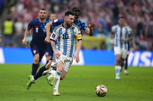 Argentina's Lionel Messi in action in front of Croatia's Josko Gvardiol during the World Cup semifinal match between Argentina and Croatia at the Lusail Stadium. (Photo | AP)