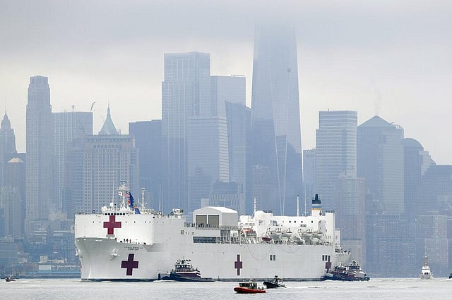 The Navy hospital ship USNS Comfort passes lower Manhattan on its way to docking in New York, Monday, March 30, 2020. The ship has 1,000 beds and 12 operating rooms that could be up and running within 24 hours of its arrival on Monday morning. (Photo | AP