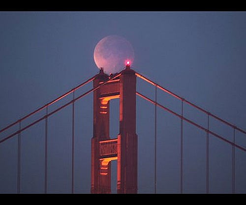 The moon is seen in the sky over the Golden Gate Bridge during an eclipse in San Francisco, USA. AP