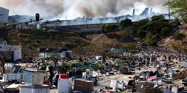 A factory burns in the background while empty boxes litter the foreground from looted goods being removed, on the outskirts of Durban, South Africa, Wednesday, July 14, 2021. (Photo | AP)