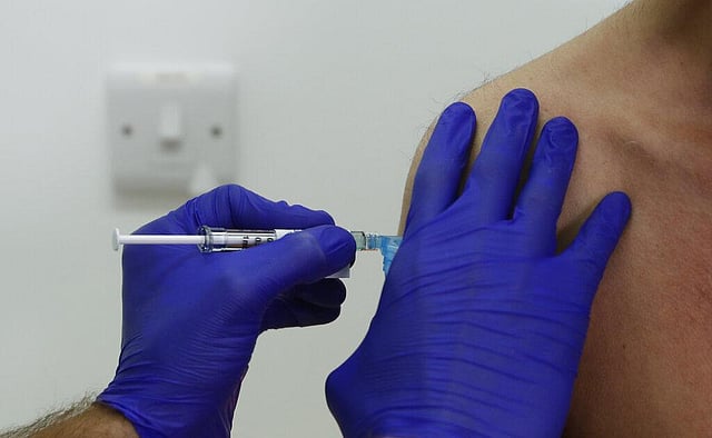 A Phase 3 Novavax coronavirus vaccine trial volunteer is given an injection at St George's University hospital in London. (Photo | AP)