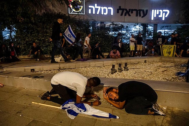Jewish nationalist demonstrators take cover during a barrage of rockets fired from the Gaza Strip toward central Israel, in the Israeli town of Ramla. (Photo | AP)