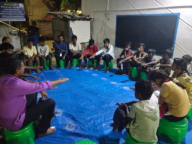 This Children’s Parliament in Kannagi Nagar comprises a group of 25 ministers. They gather together every Saturday evening around 6.30 pm under the streetlights of Ambedkar Iravu Padasalai.