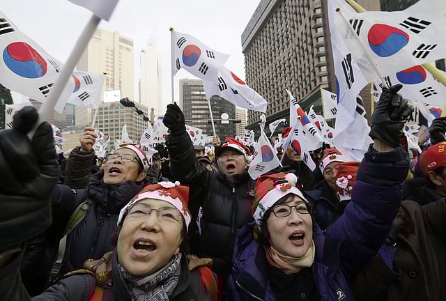Thousands of Park's conservative supporters rallied in nearby streets, waving the national flag and shouting for Park's powers to be restored.