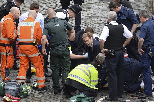 Foreign Office minister Tobias Ellwood was pictured helping to give first aid to an injured police officer.