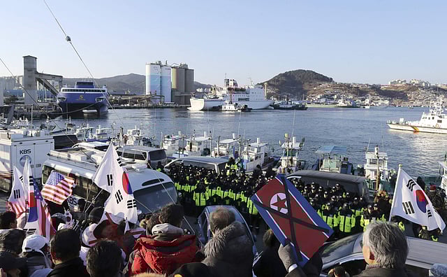 SEOUL: South Korean activists burned the North's flag Sunday near a theatre where Kim Jong Un's sister and the South's President were to watch a Northern musical display in the culmination of their Olympic rapprochement.