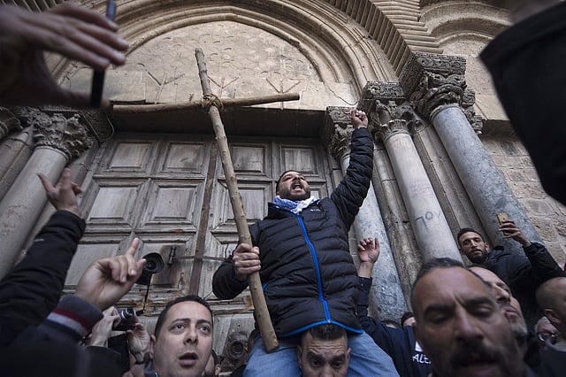 The two men who act as keepers of the key of the church opened its large wooden doors at around 4:00 am (0200 GMT), ending the protest that began on Sunday at noon.